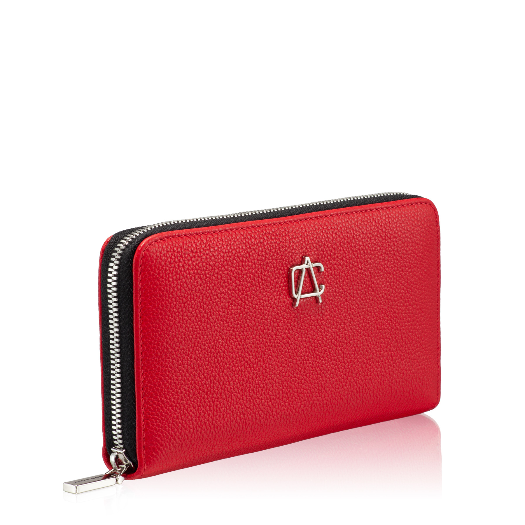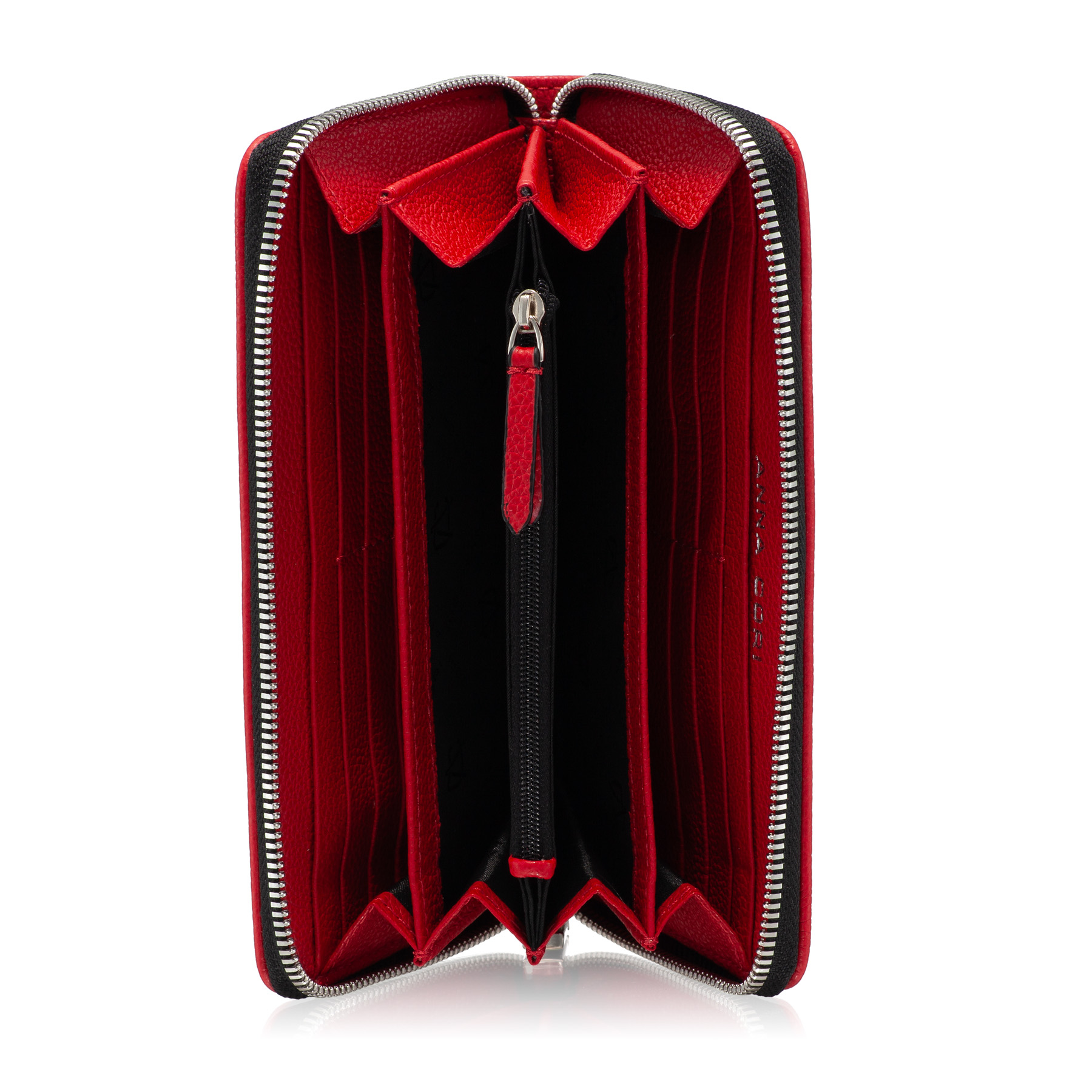 Portofel dama din piele naturala. Este prevazut cu 4 compartimente pentru depozitare bani, un buzunar cu fermoar pentru monede si 8 spatii pentru depozitare carduri.Inchiderea se face cu fermoar.