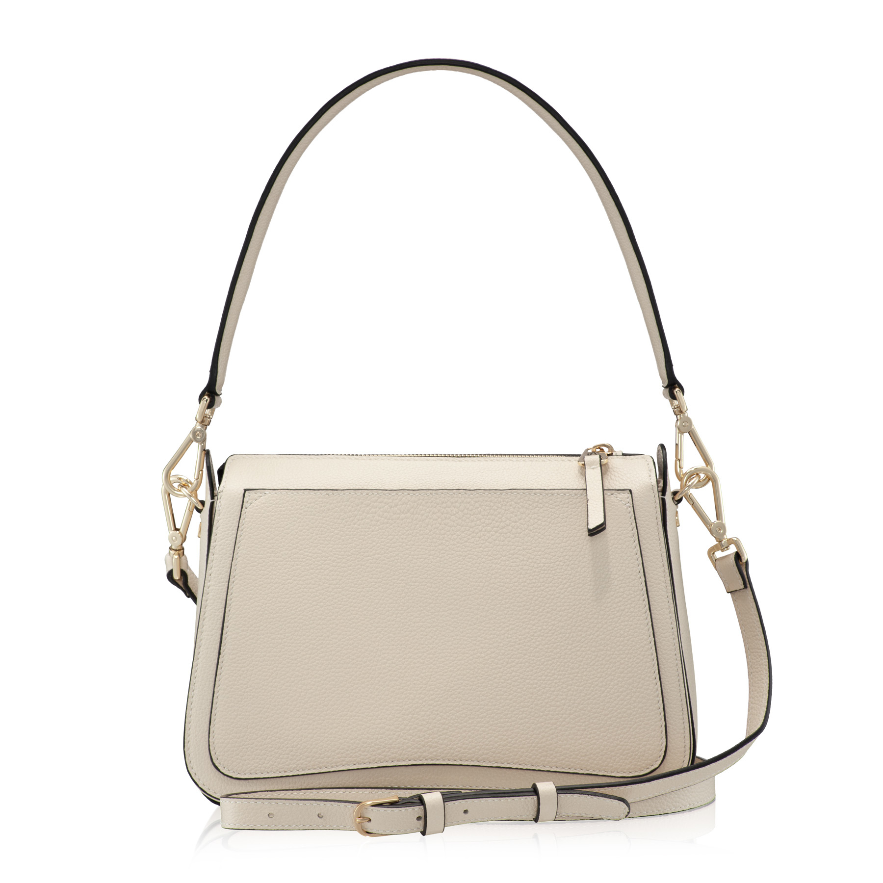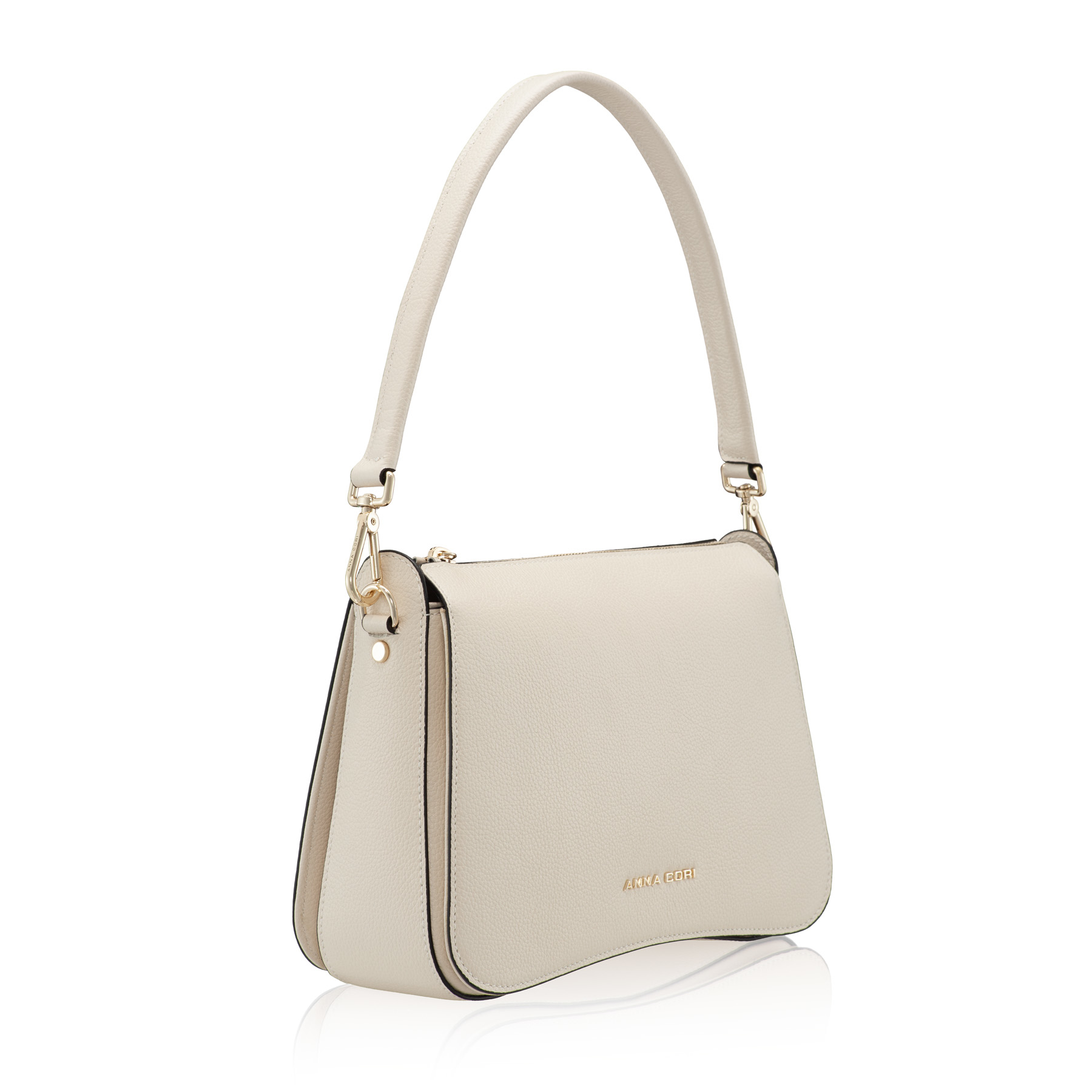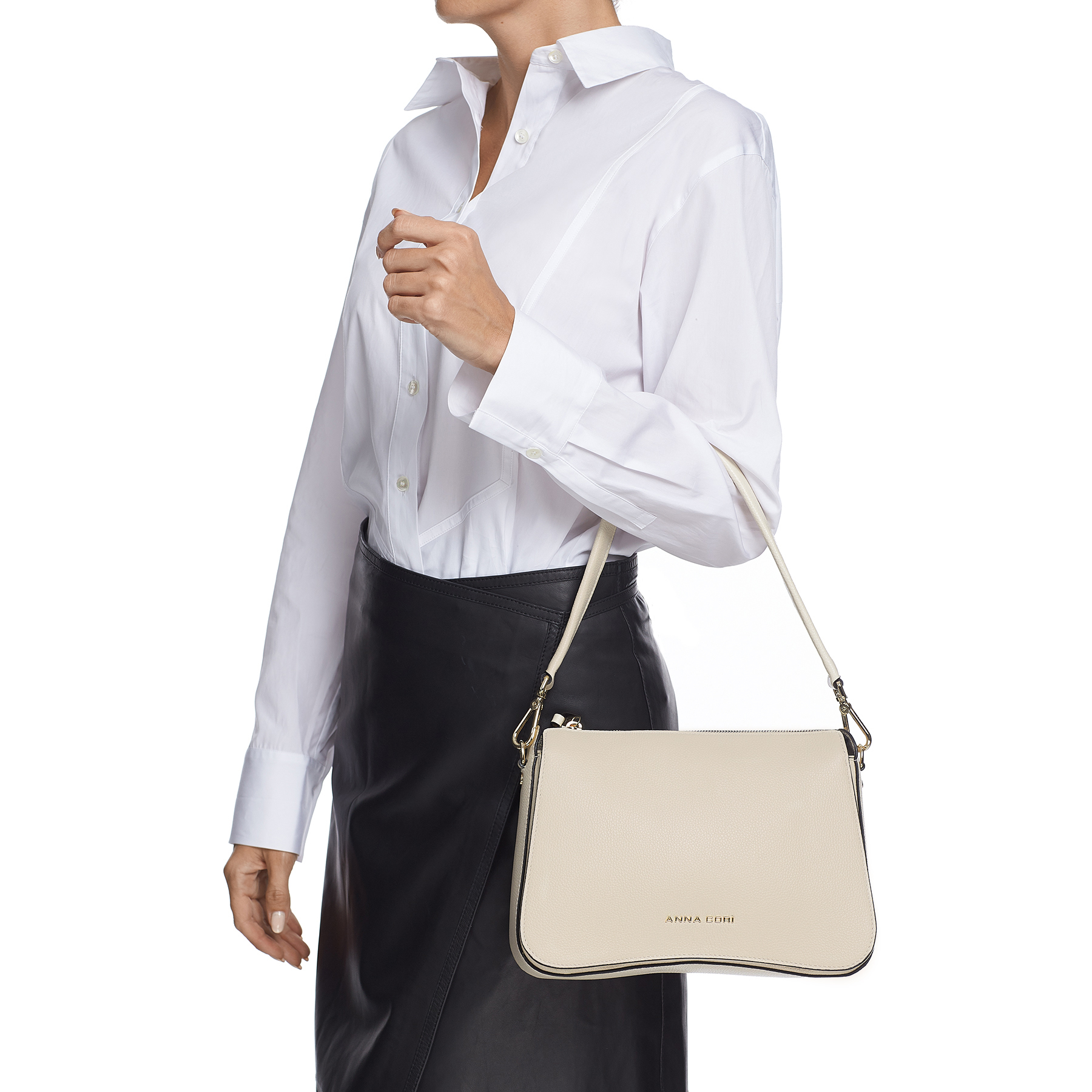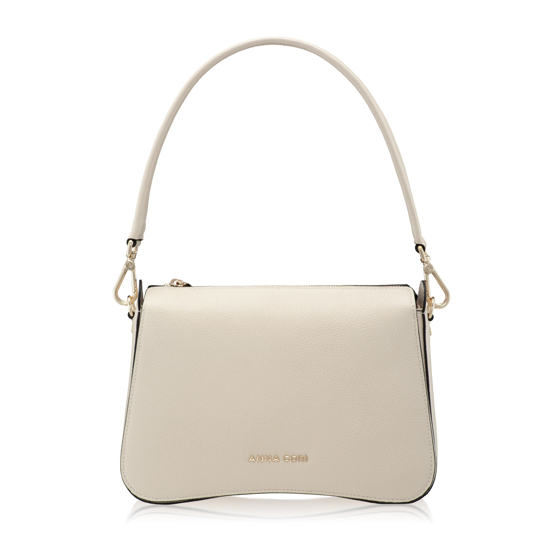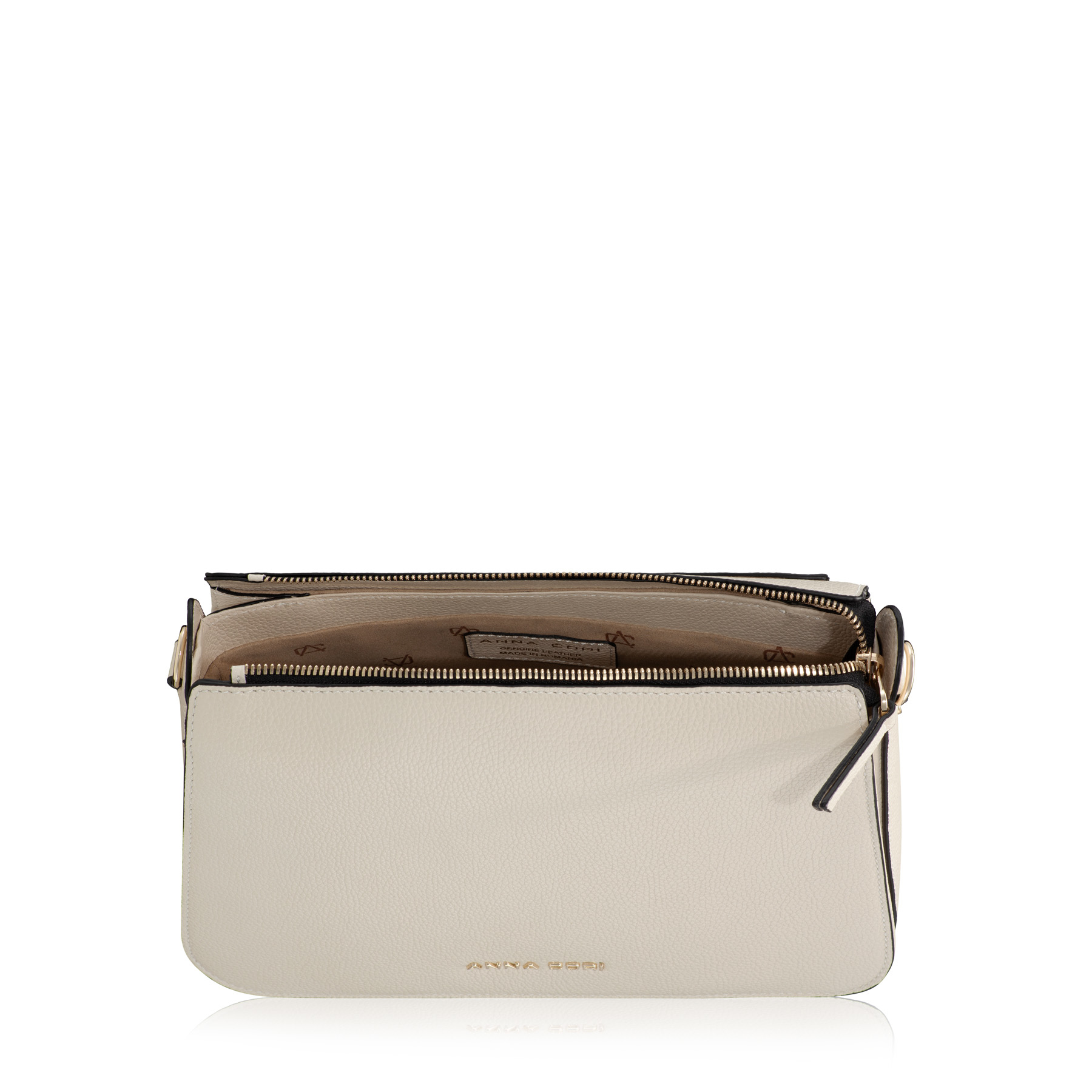 In interior este prevazuta cu doua compartimente si cu un buzunar cu fermoar.La exterior contine un buzunar la spate.Bareta de umar este detasabila, iar inchiderea se face cu fermoar.