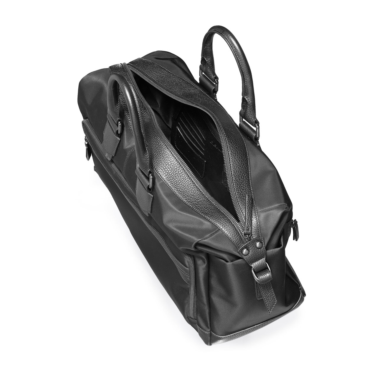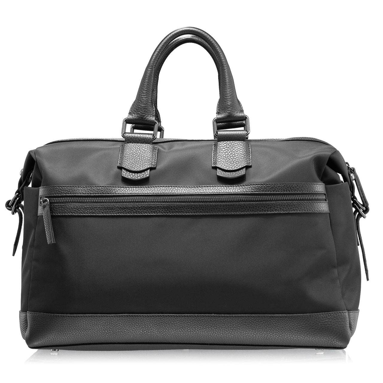 Geanta de voiaj din piele naturala si material textil. La interior este prevazuta cu un compartiment mare, doua buzunare cu fermoar si un buzunar aplicat. La exterior, are trei buzunare cu fermoar si doua aplicate. Bareta de umar este detasabila si ajustabila. Inchiderea se face cu fermoar.