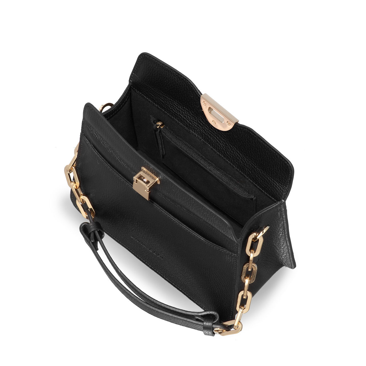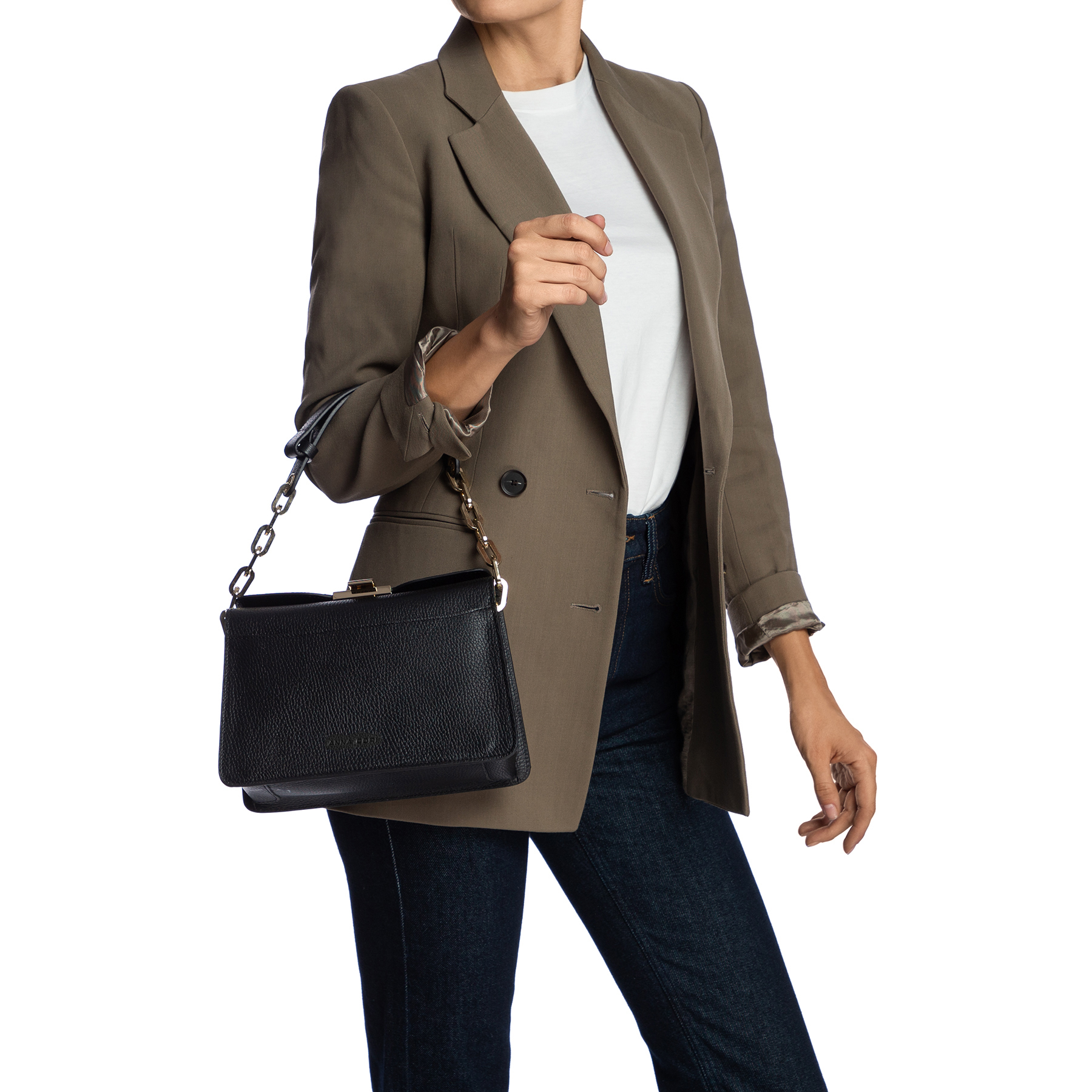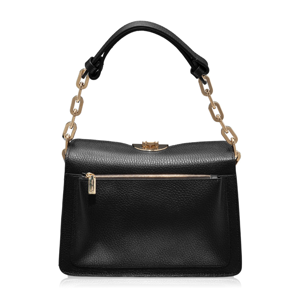 Geanta de umăr, Felicia, reinterpretează desingul contemporan cu cel clasic. O geantă compactă, dar în același timp încăpătoare, care subliniază eleganța. Detaliul special al acestui model este exprimat prin închiderea cu accesoriu metalic deasupra genții. Mânerul din piele este ușor reglabil și accesorizat cu un lanț metalic.