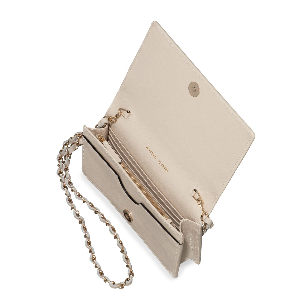 Geanta plic ARNA este un model Icon Anna Cori datorită eleganței de care dă dovadă și diversității nuanțelor în care se regăsește. Este compartimentată într-un mod complex, având două compartimente, un buzunar central cu fermoar și 6 spații pentru depozitare carduri. Monograma Anna Cori din metal auriu reușește să adauge un plus de eleganță.