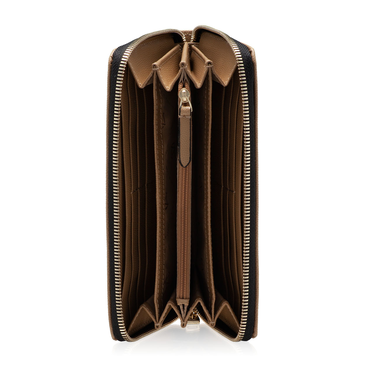 Este prevazut cu 4 compartimente, un buzunar cu fermoar pentru monede si 8 spatii pentru depozitare carduri.