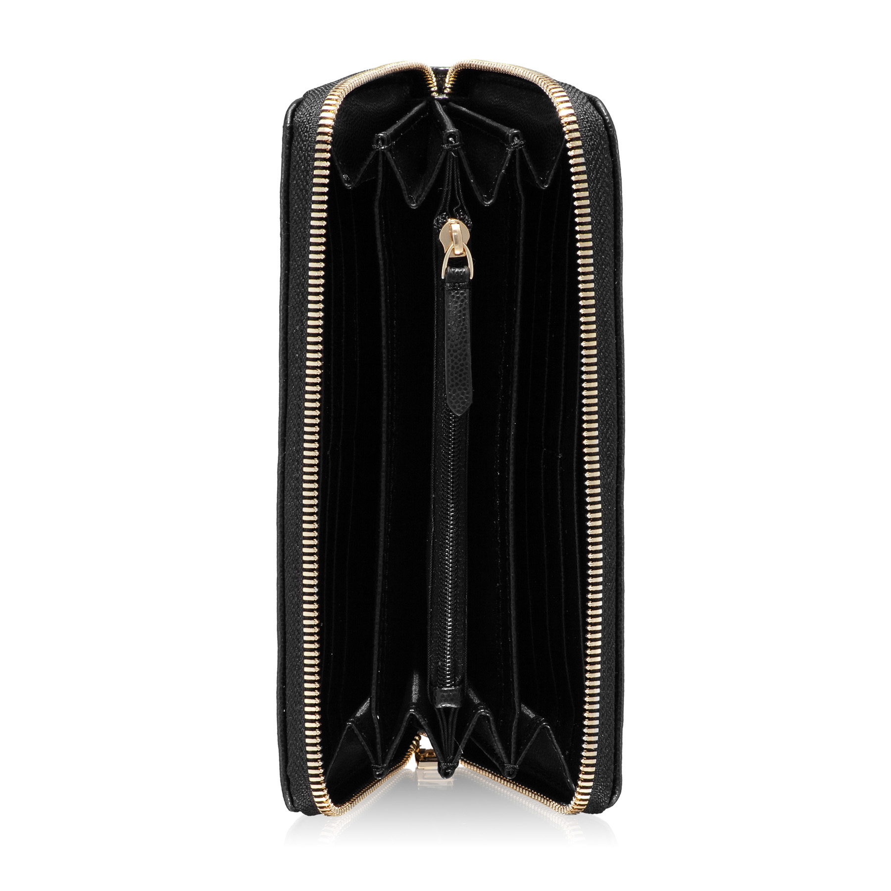 Portofel dama din piele naturala, prevazut cu 4 compartimente, un buzunar cu fermoar pentru monede si 8 spatii pentru carduri.