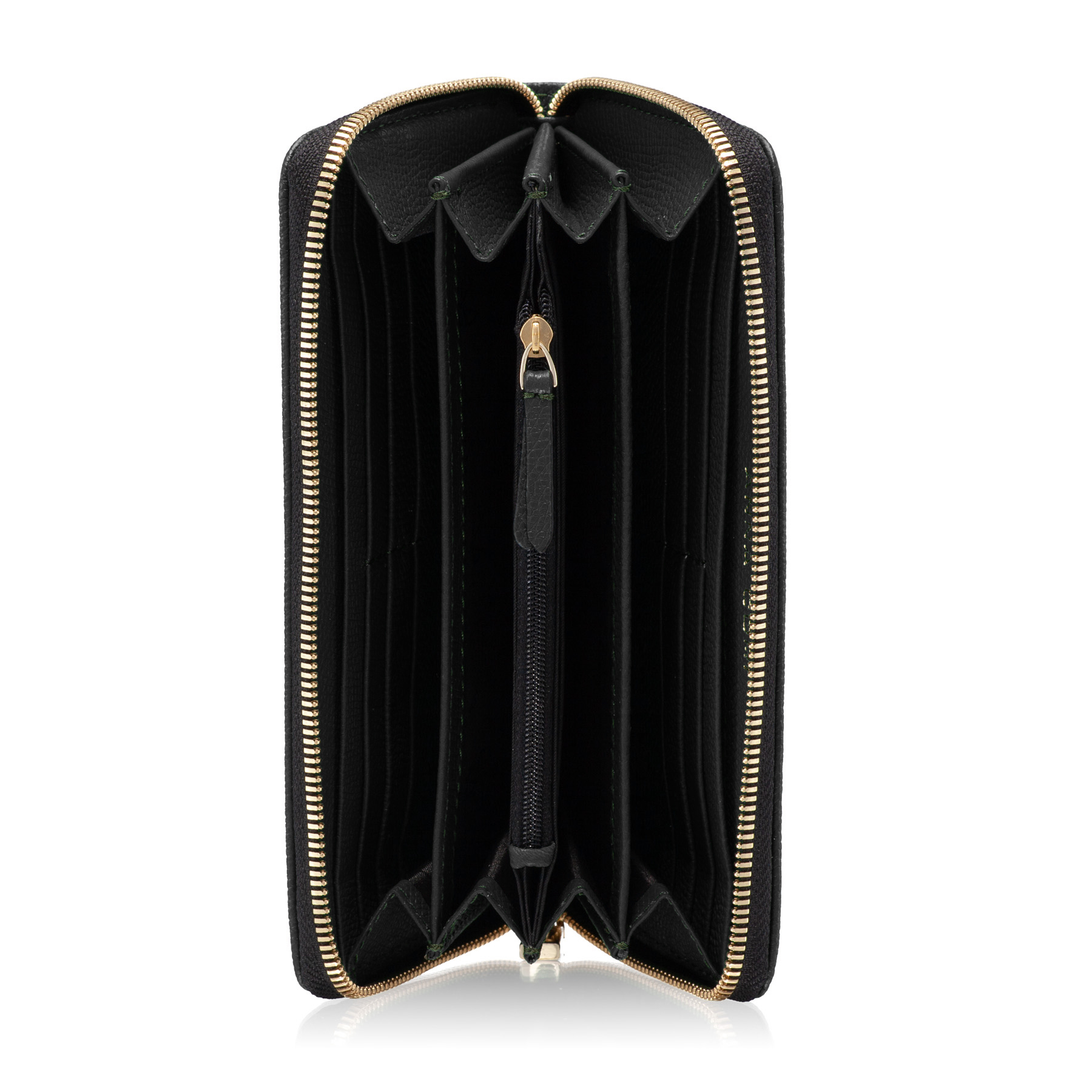 Portofel dama din piele naturala, prevazut cu 4 compartimente, un buzunar cu fermoar pentru monede si 8 spatii pentru carduri.