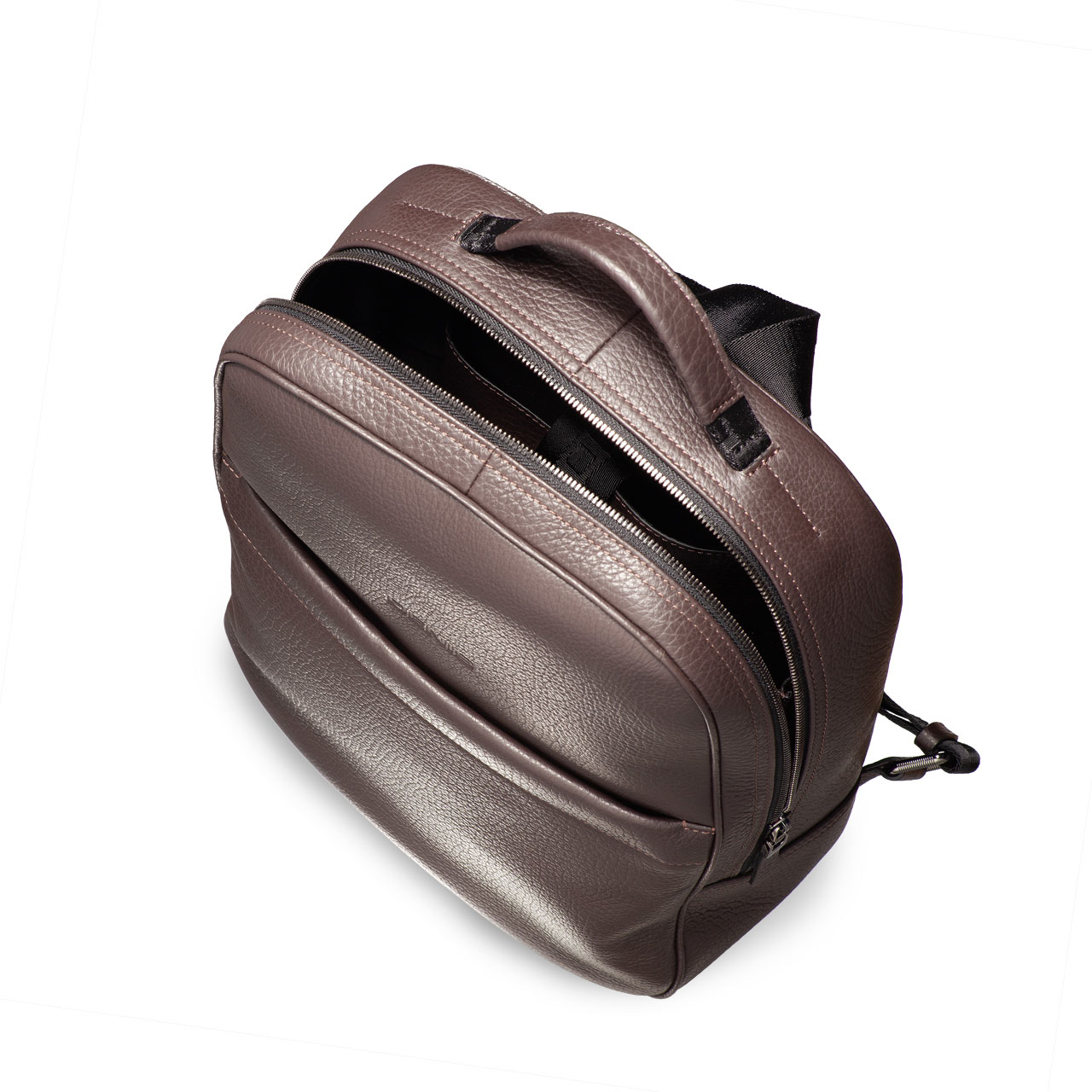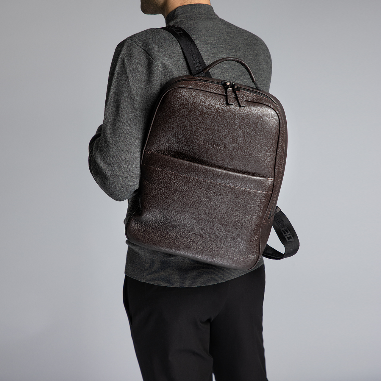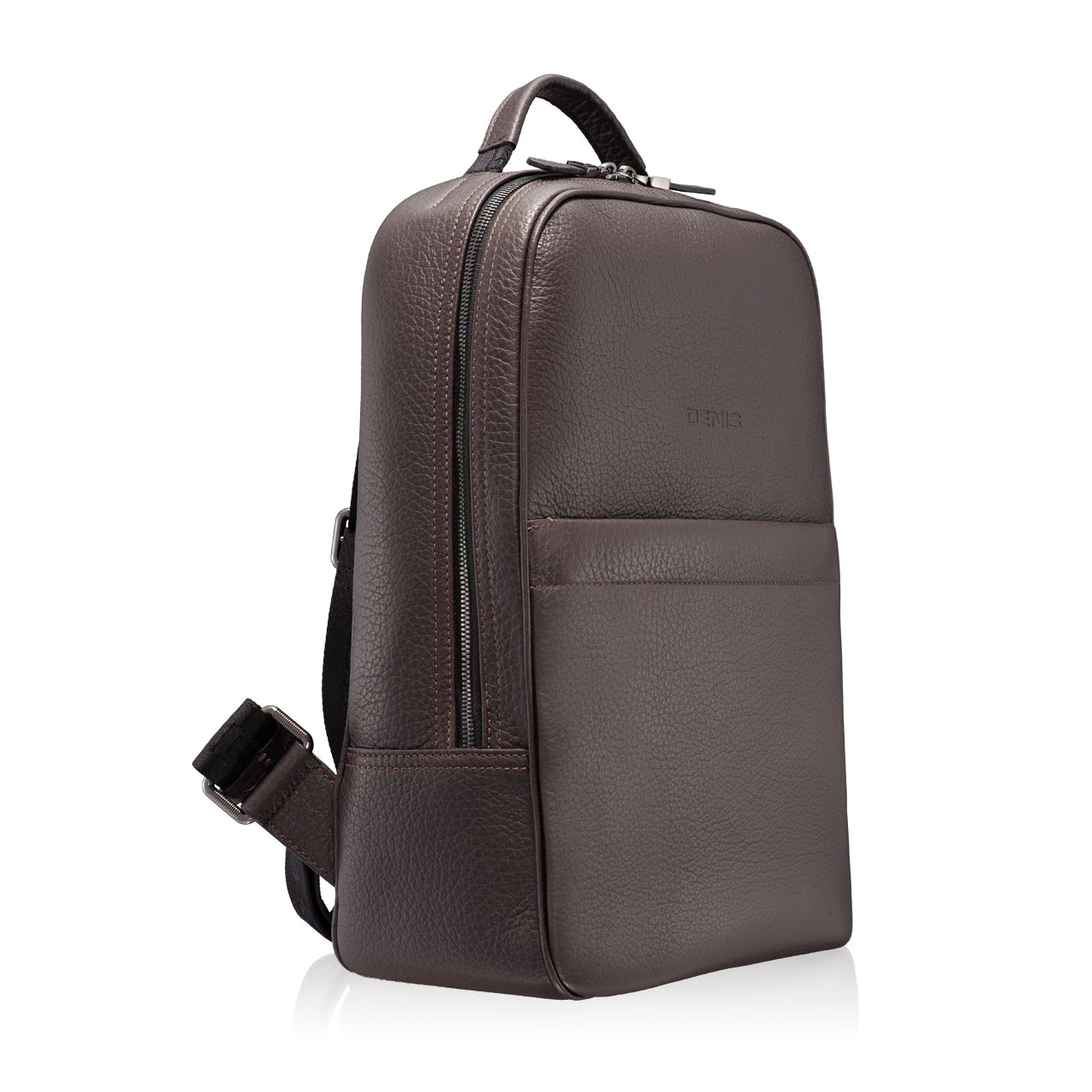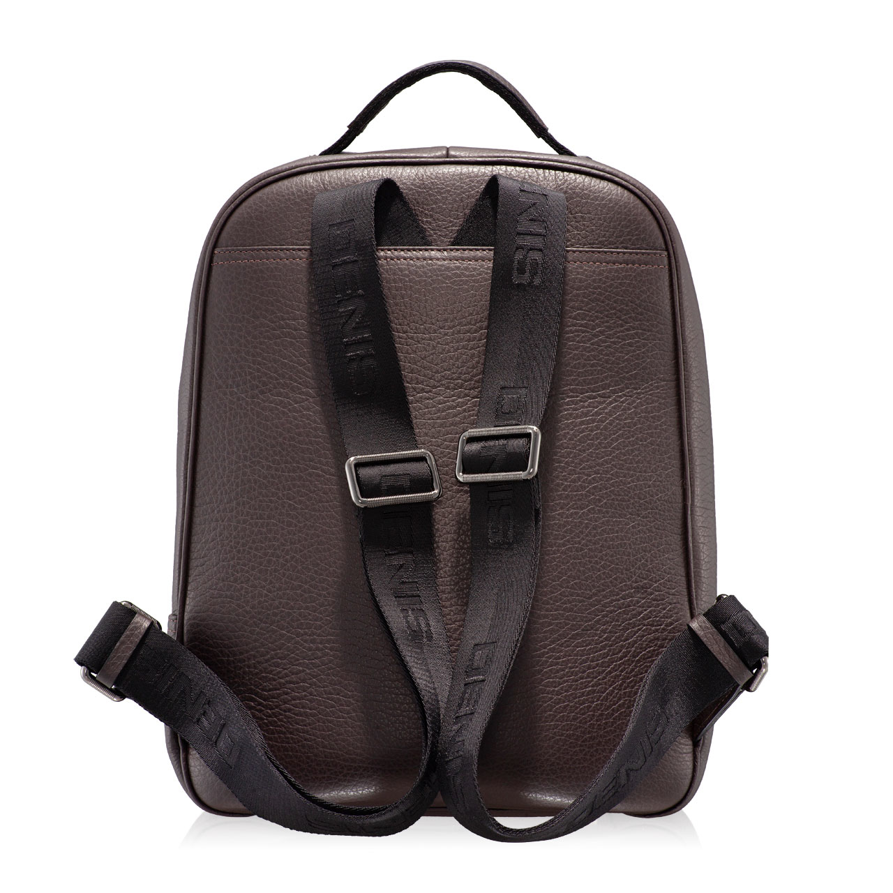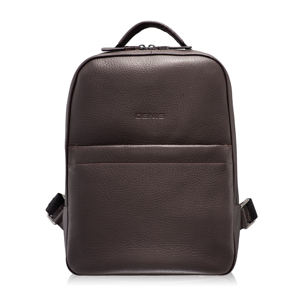 Rucsac barbati din piele naturala, cu maner si doua barete reglabile de umar. Este stampat cu logo-ul Denis. Prevazut cu un compartiment, un buzunar interior si unul exterior cu fermoar.