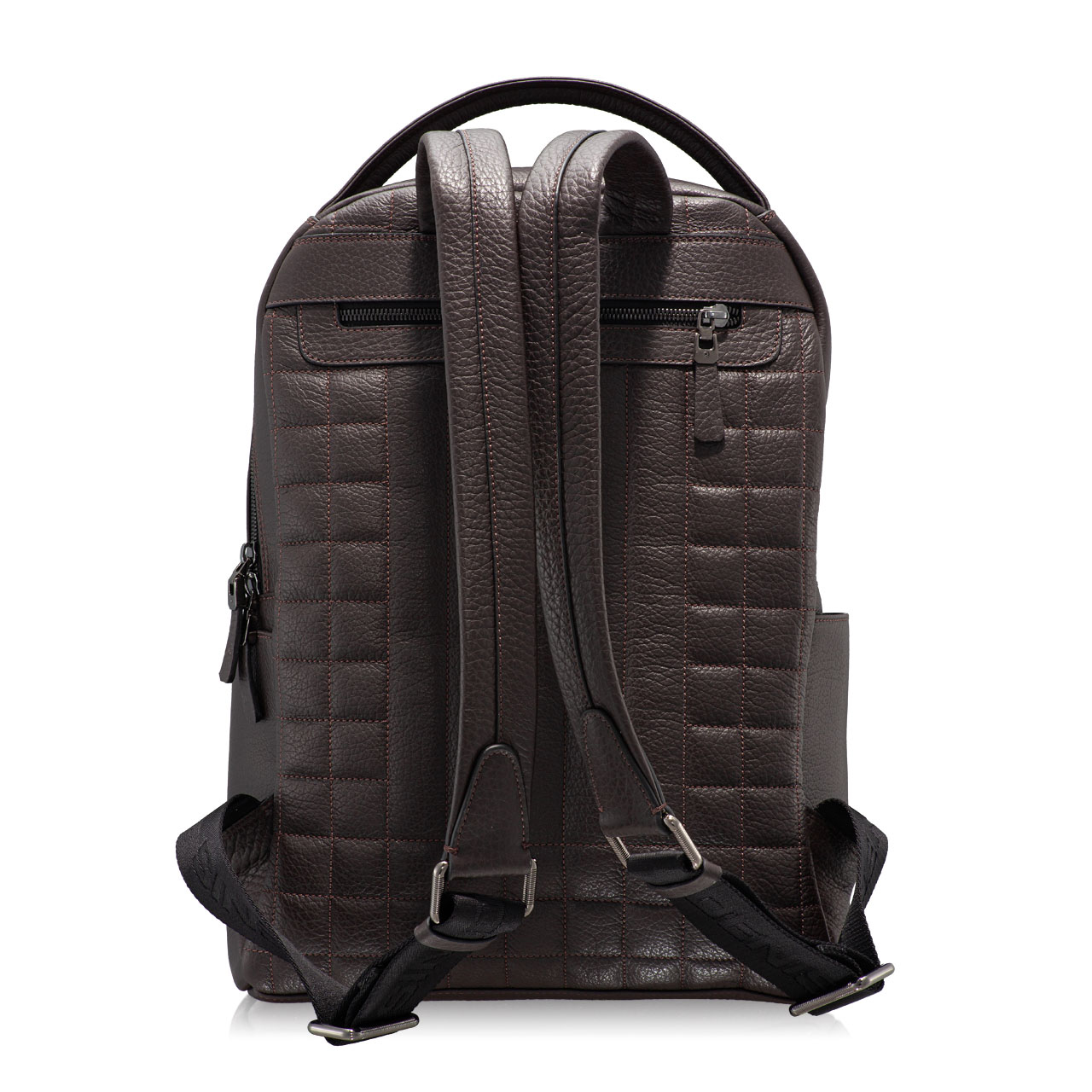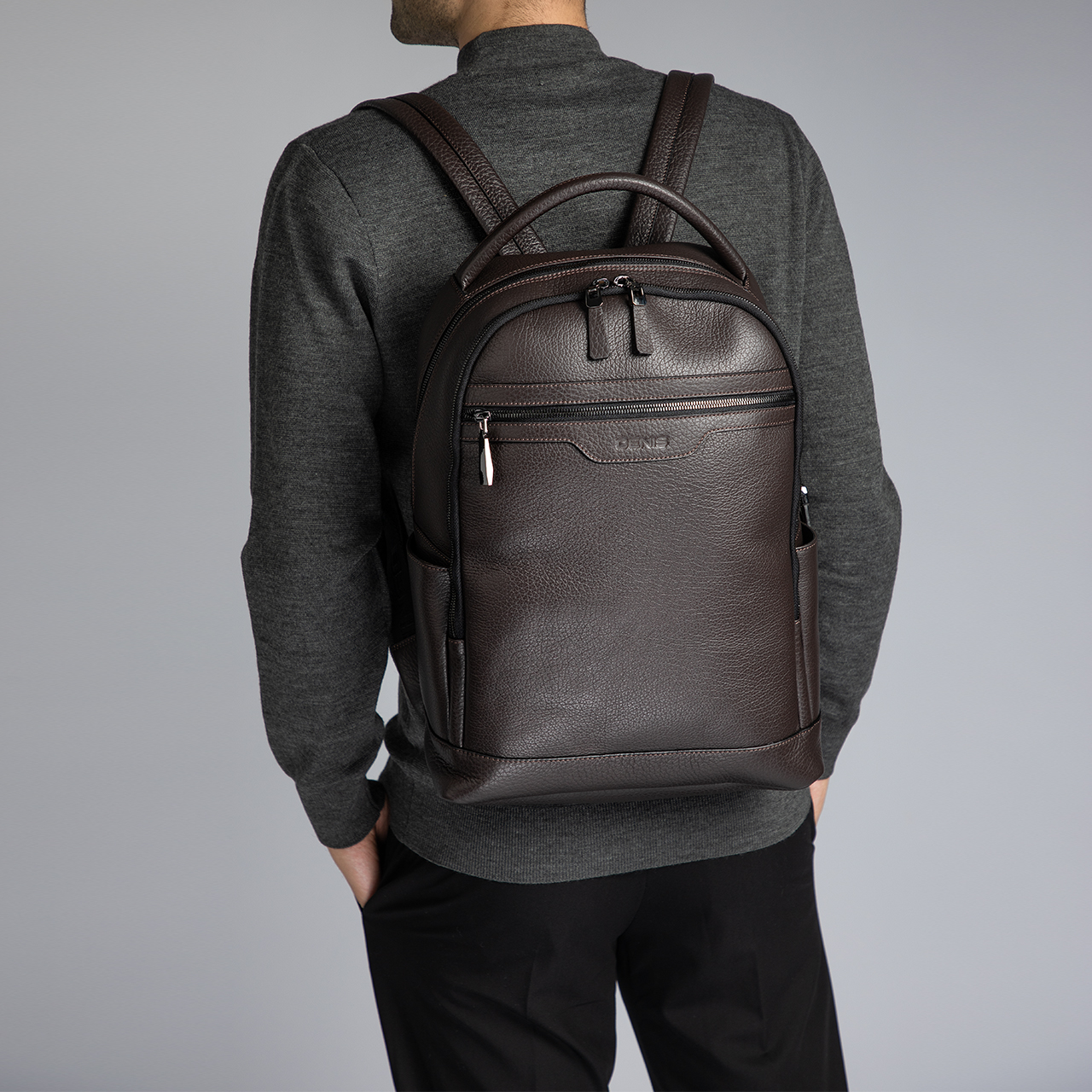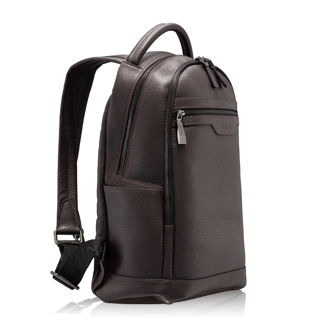 Rucsac barbati din piele naturala, personalizat cu logo-ul Denis stampat. Este prevazut cu maner si doua barete reglabile de umar. Contine cu doua compartimente, un buzunar interior si doua buzunare exterioare cu fermoar.